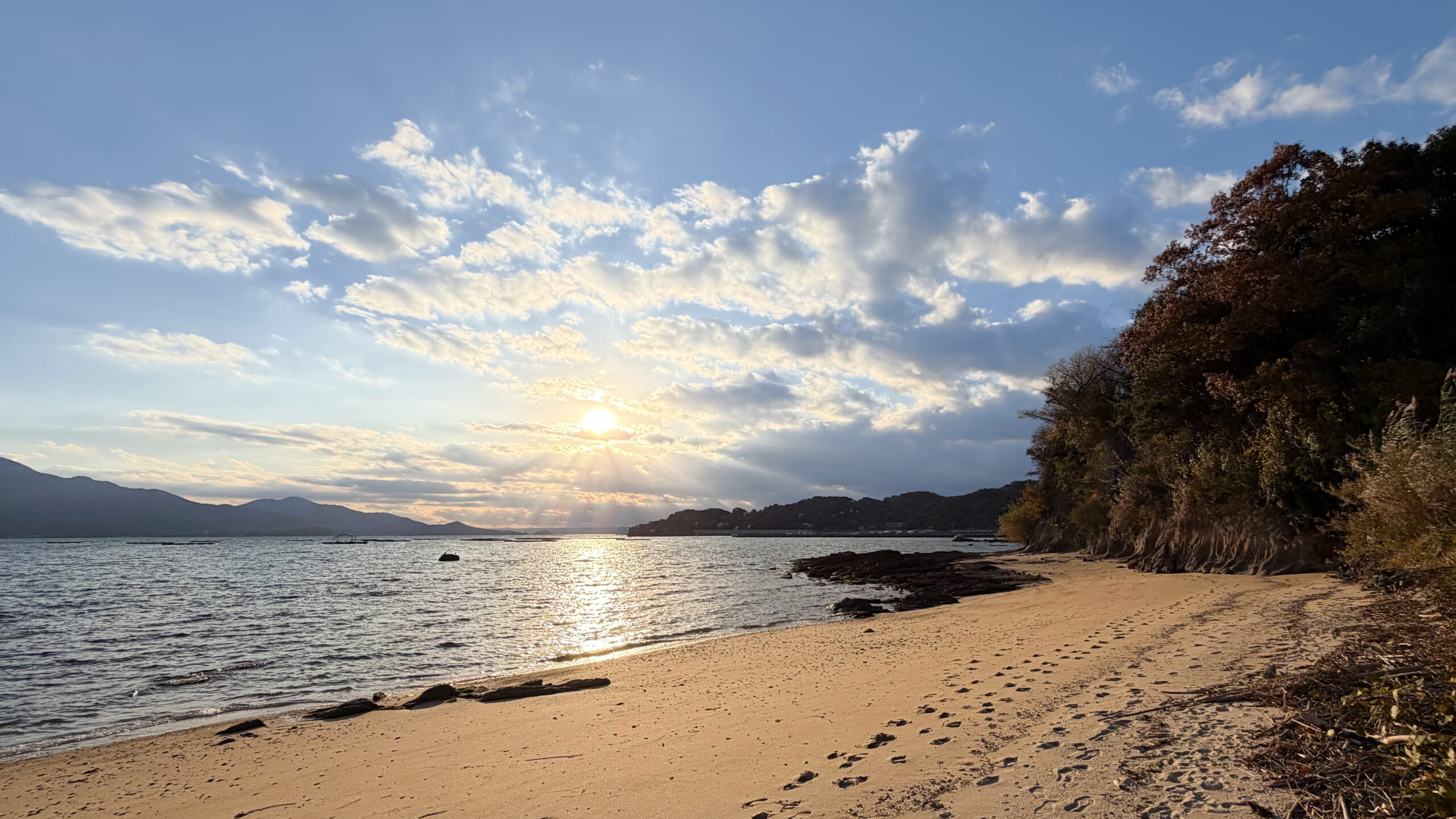 夕焼け色に染まっていく水平線を眺めながら、ビーチで焚き火に点火。