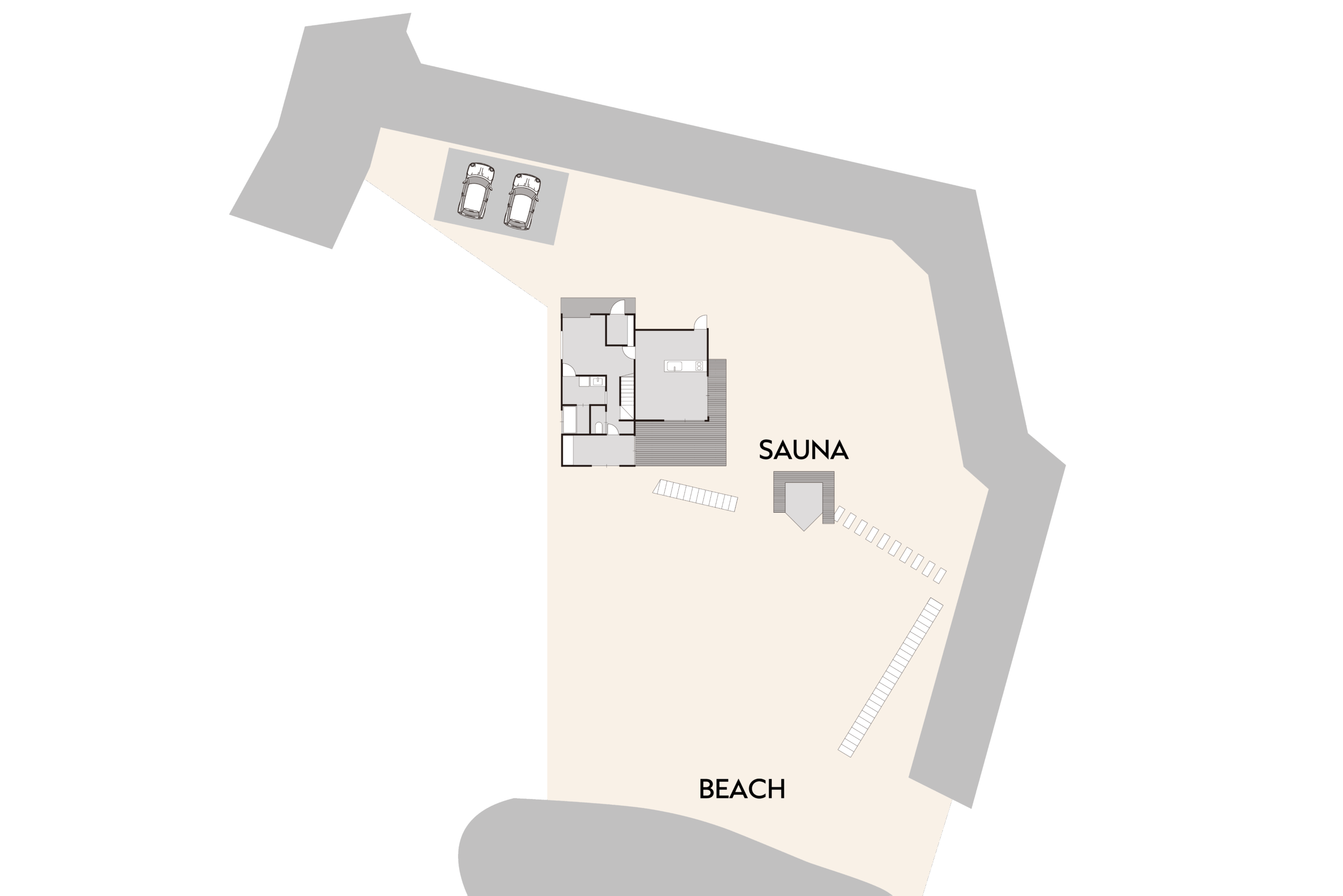 汗を流した後は、海とウッドデッキのどちらへも行けるように、サウナの両側にドアを配置。