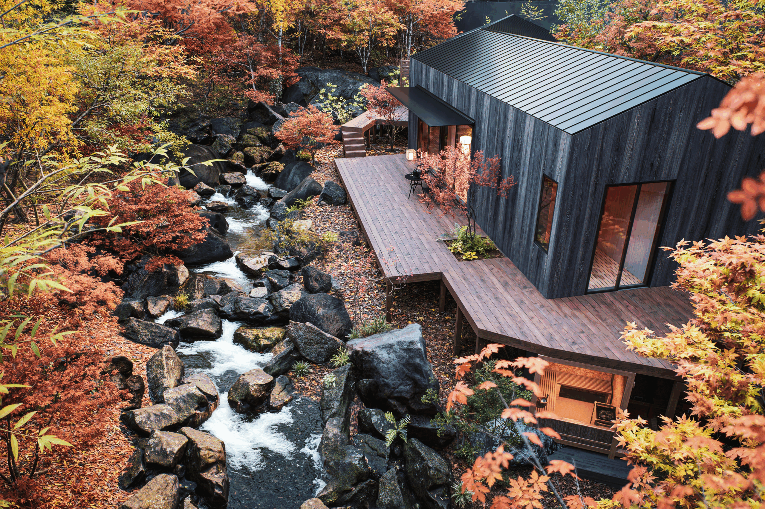 敷地内を流れる渓流が、四季折々の自然を鏡のように映し出す。