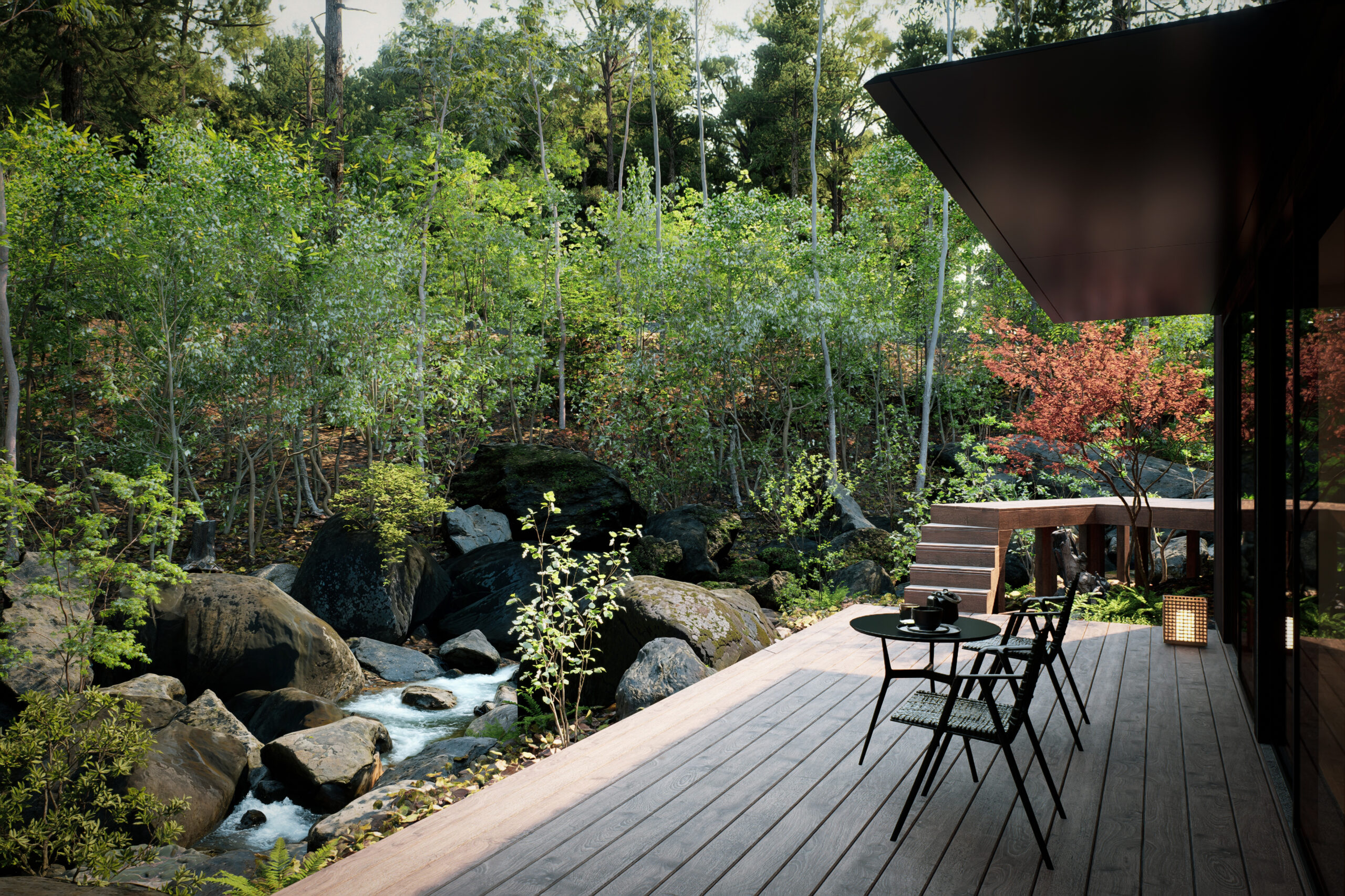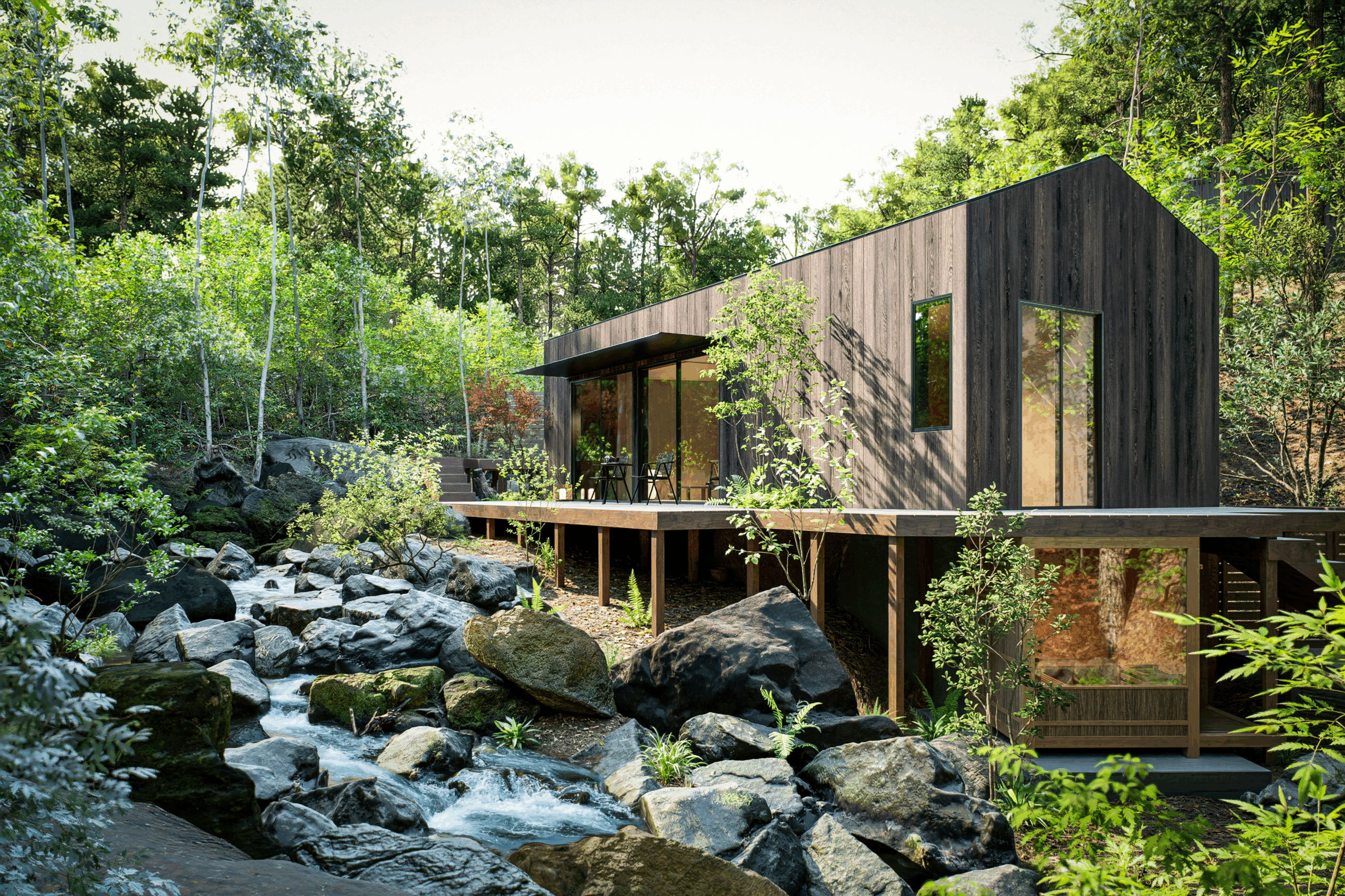 自然に抱かれた渓流沿いの土地に新築された平屋ヴィラは、デザイン・自然・静けさが融合した空間。