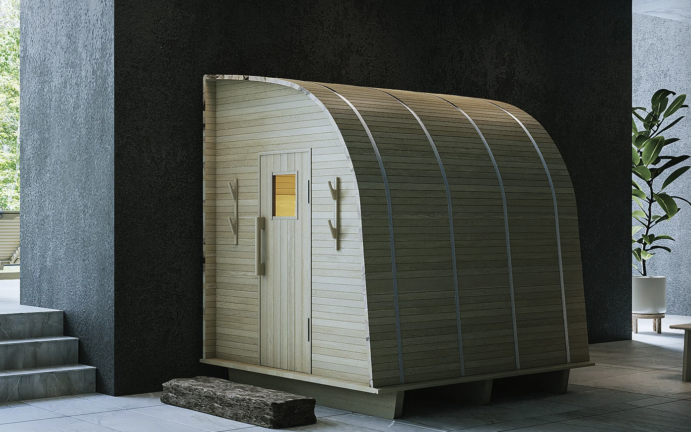 ハーフドーム型のフォルムで熱の流れと蒸気の循環を最適化し、家具メーカーならではの素材の選び方や木工技術が肌触りと質感に表れています。