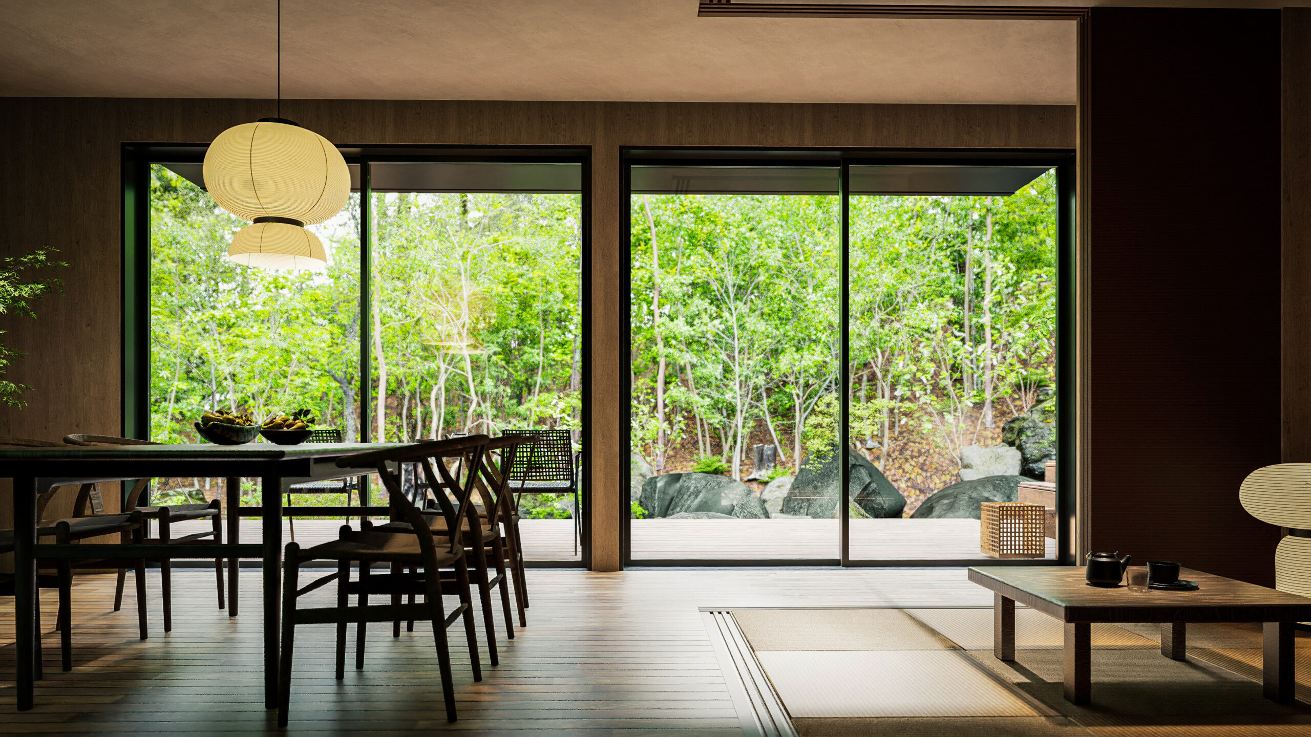 大きな窓からは渓流や四季折々の風景が広がり、時間の流れがゆるやかになる感覚を味わえる空間です。