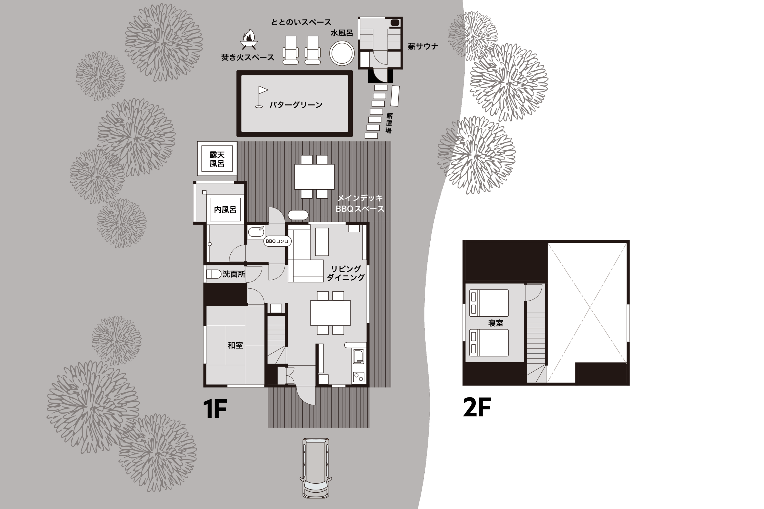 広い庭にはBBQができる大型ウッドデッキ、天然温泉の露天風呂、6畳を超えるガラス張りのプライベートサウナ、広いパターグリーンスペースを用意。