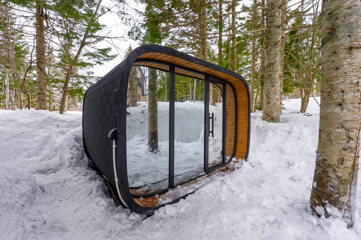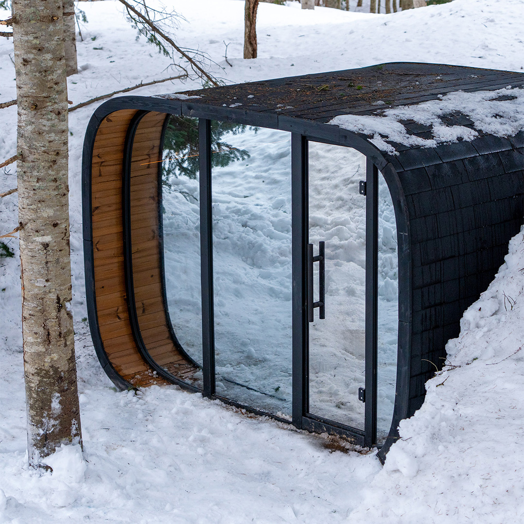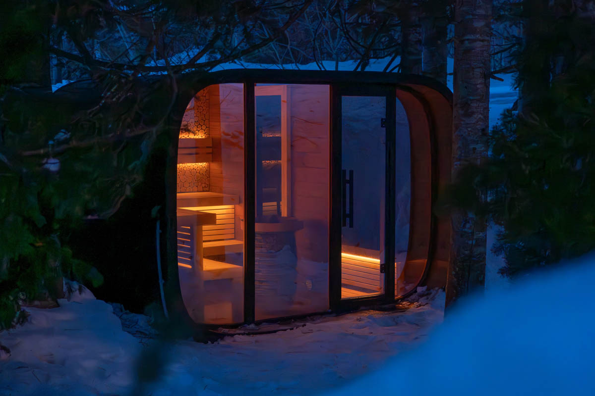 Round Cube Double Mirror は、二室構成と前面ミラーガラスを組み合わせたサウナ。