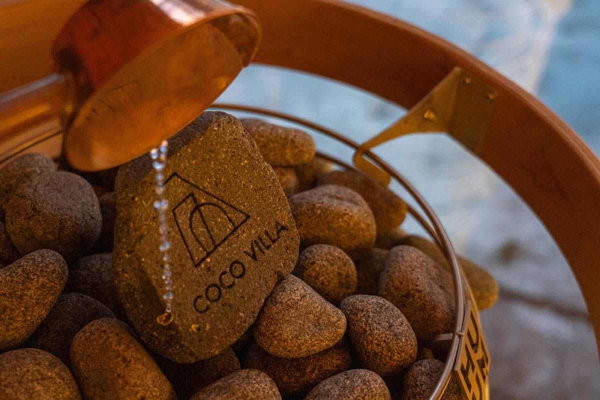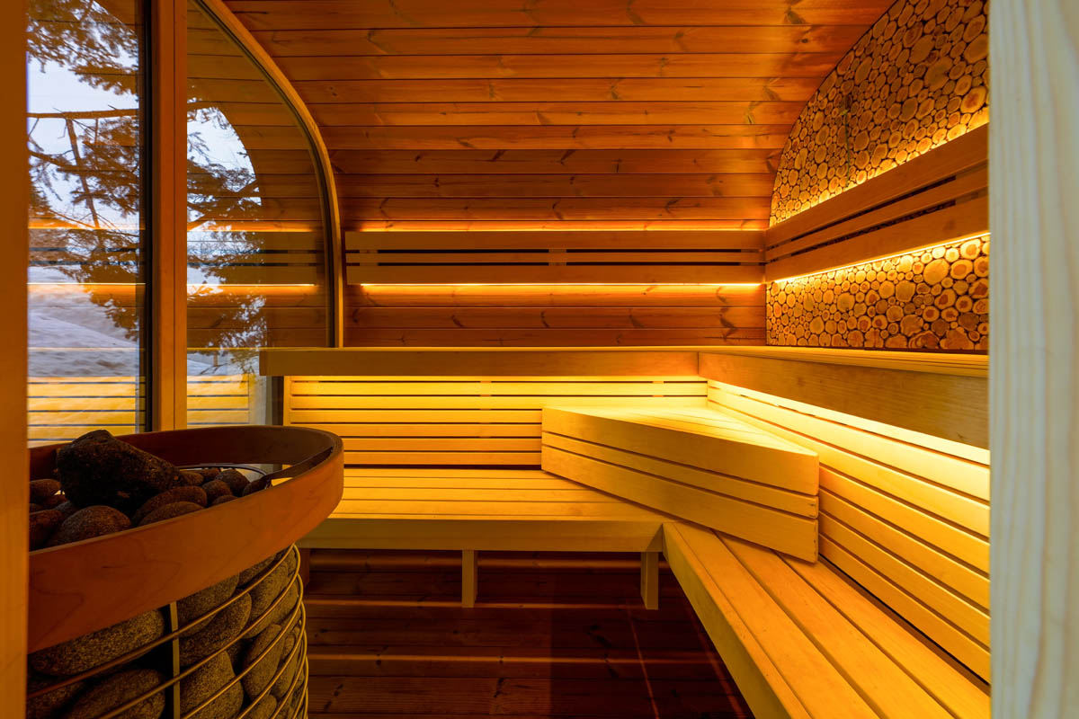 ラウンド形状が熱と蒸気をやわらかく循環させ、L字ベンチで“座る/横たわる”が自在。