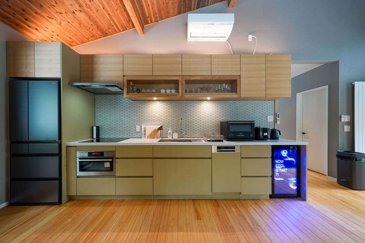 延床約157㎡の2階建て、無垢フローリングと天井高リビングが生む開放感が心地よく、三重ガラス×二重断熱×高効率薪ストーブ+パネルヒーターで厳冬期も快適。