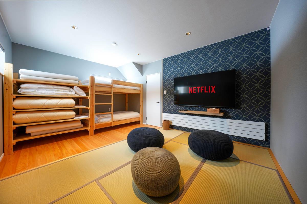 1F 和洋室:シングルベッド2床(二段ベッド)・布団2組、2F 洋室A:ダブルベッド1床、洋室B:ダブルベッド1床