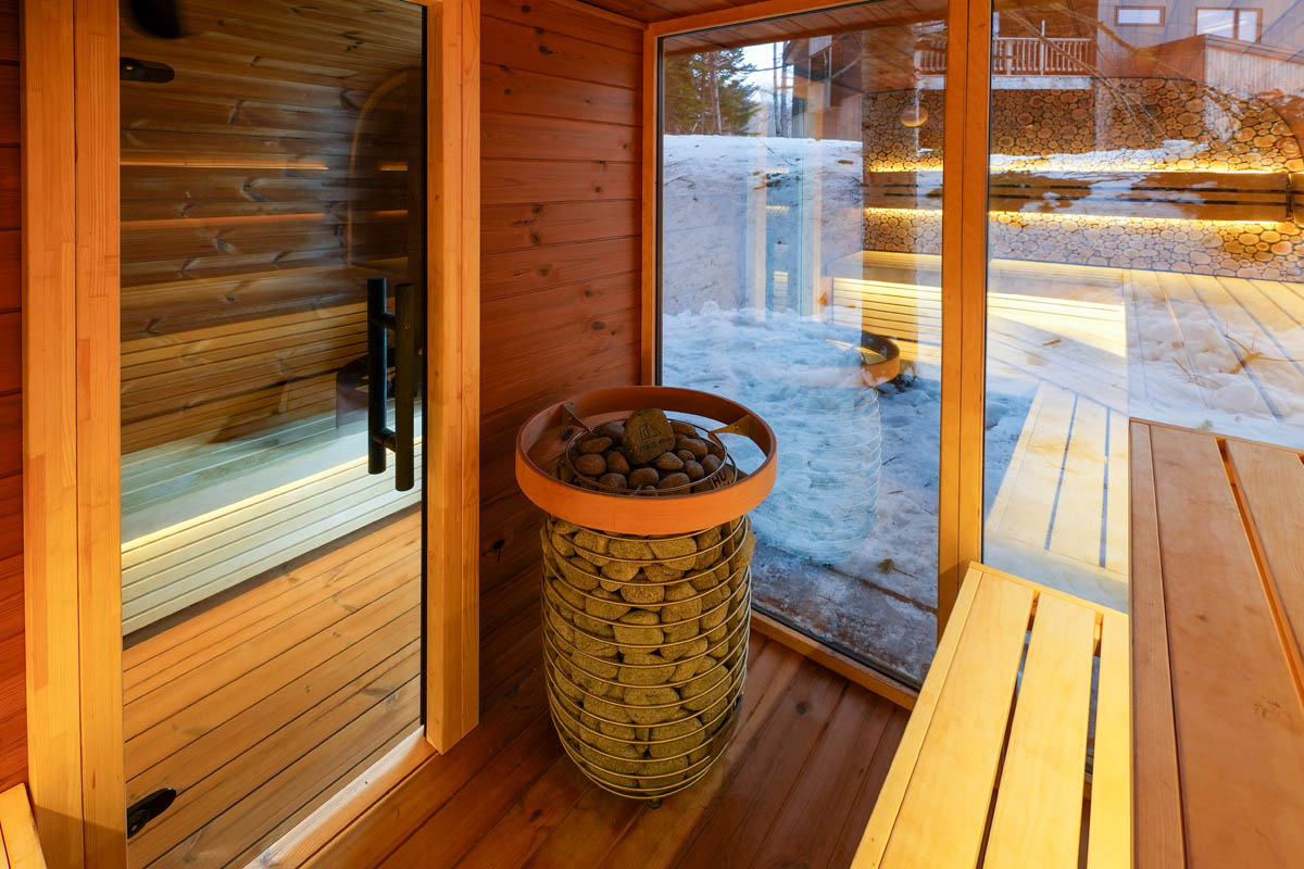 戻れば大型ガレージで荷下ろし→広い乾燥室でブーツをケア、夜は薪ストーブとサウナでリカバリー。