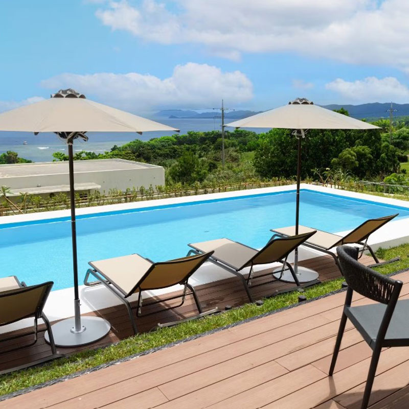 高台から海を望むロケーションと、プールの水面越しに広がるオーシャンビューが、石垣島ならではの開放感を際立たせます。