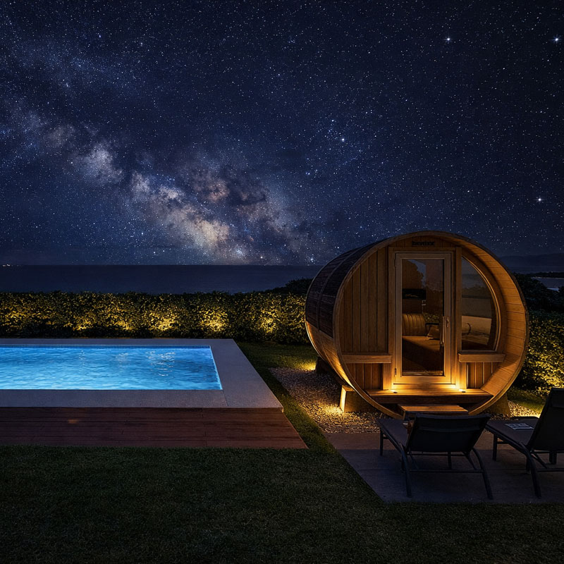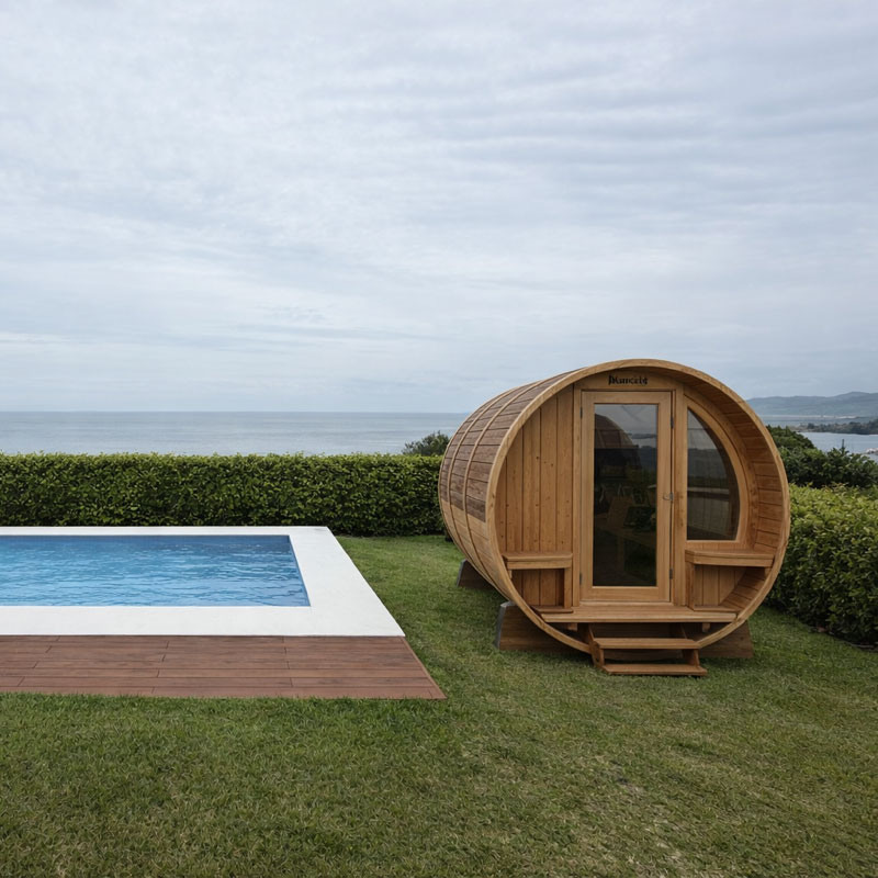 屋外プール横に、HARVIA製のバレルサウナを設置。