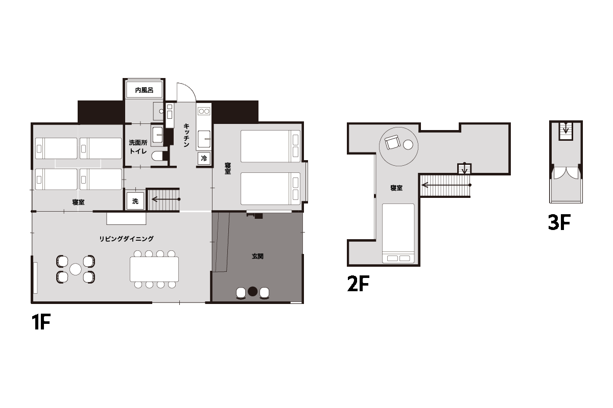 1F 洋室:シングルベッド 2床、1F 和室:シングル布団 3組、2F LOFT:シングルベッド 2床 ※ 予定
