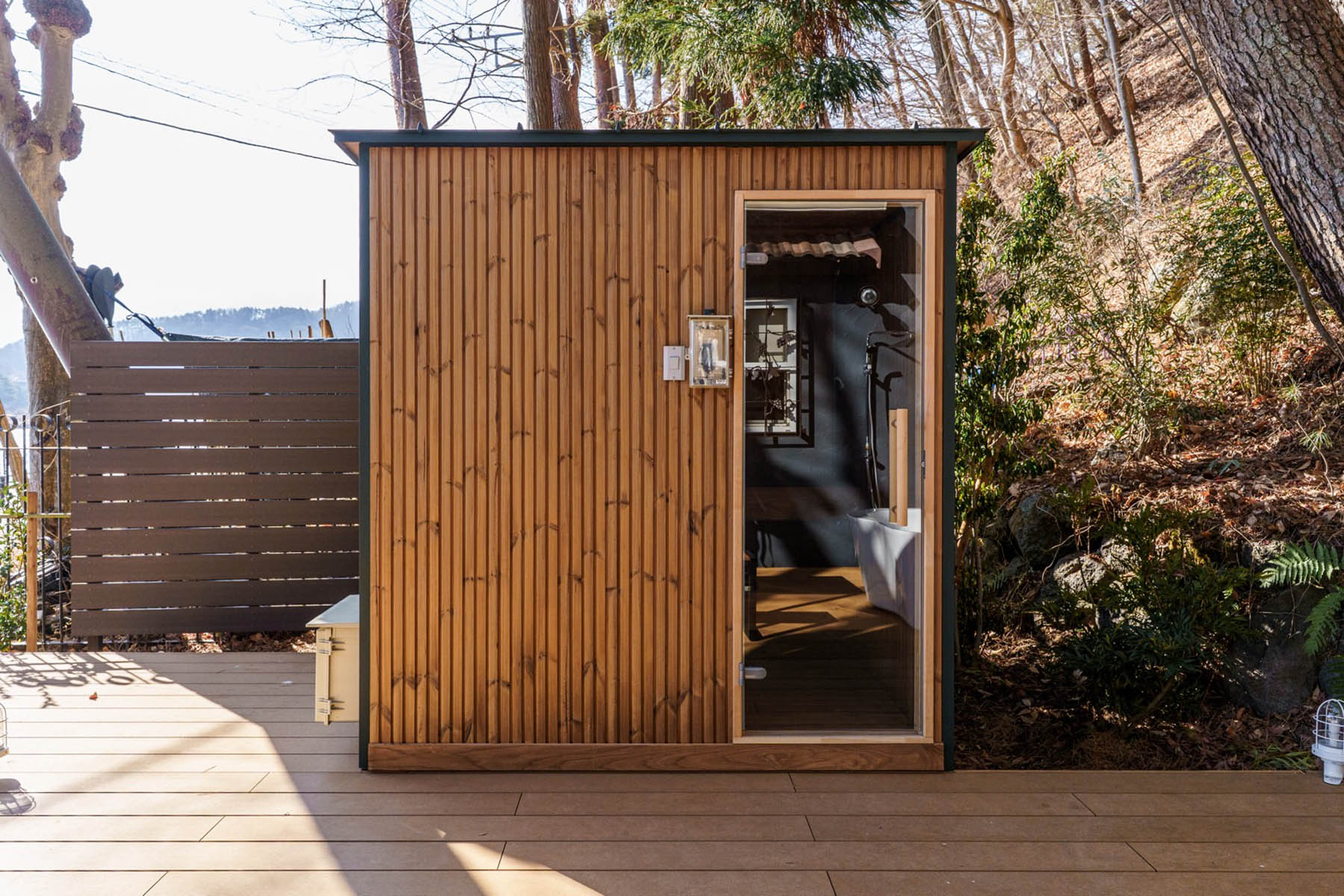 プライベートガーデンの一角には、自然と一体化できるサウナを設置。