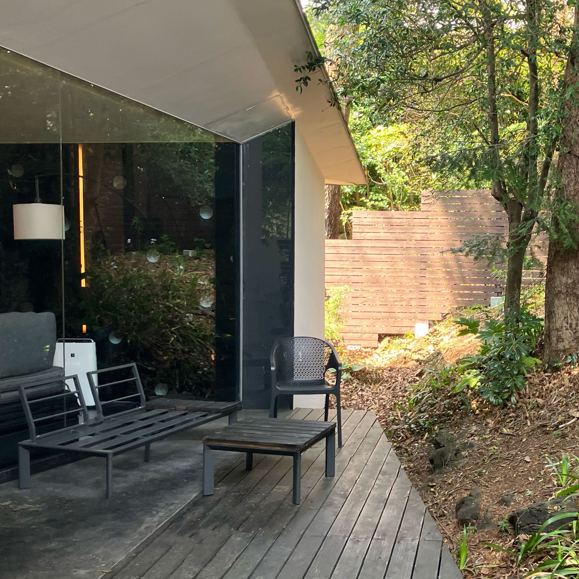 ガラスの視覚効果を利用した独特のデザインで、ヴィラ内にいながらまるで森の中にいるような感覚に。
