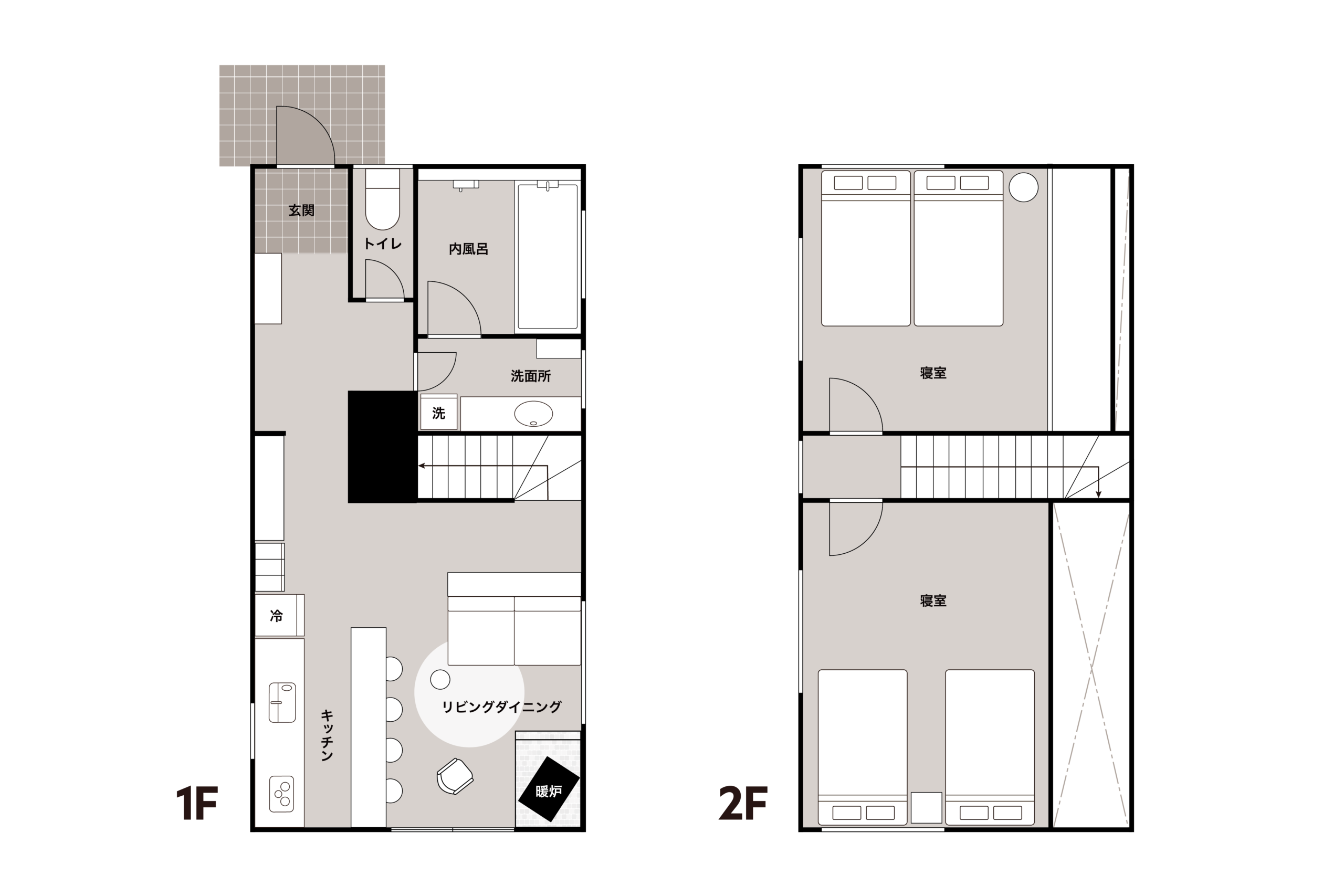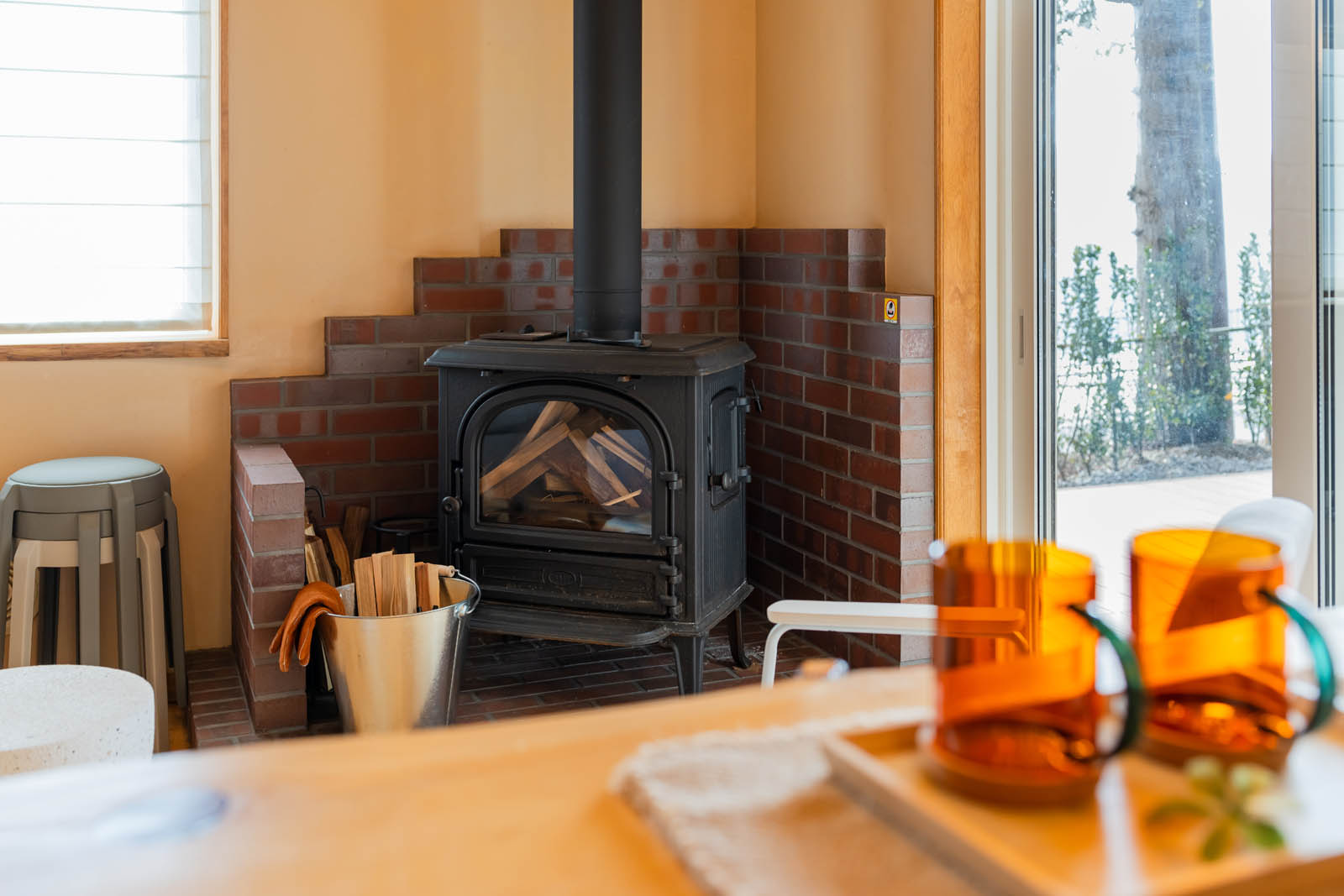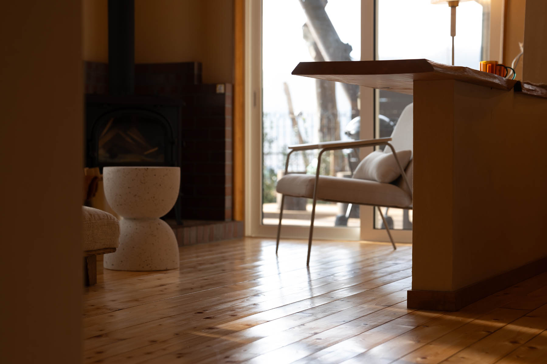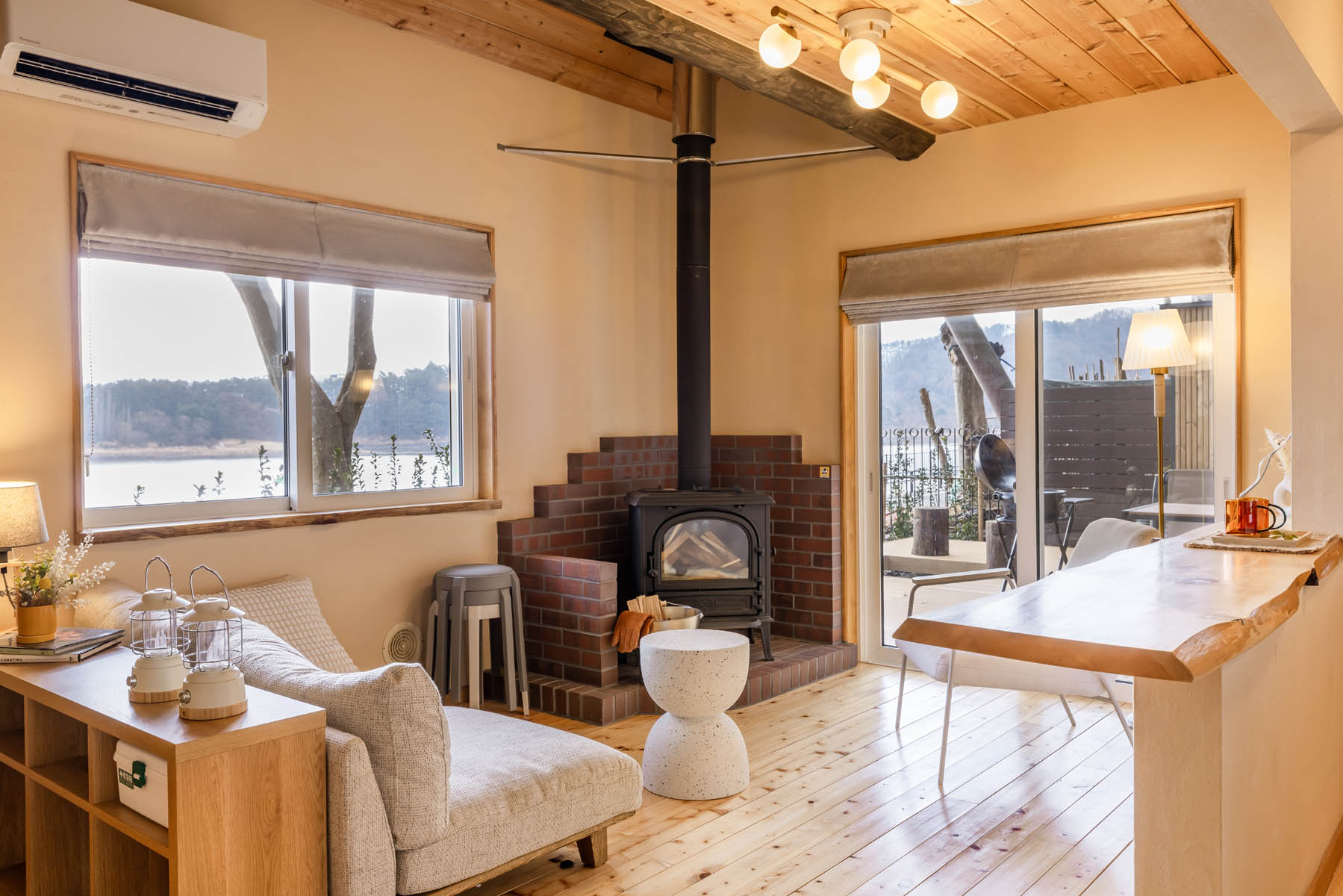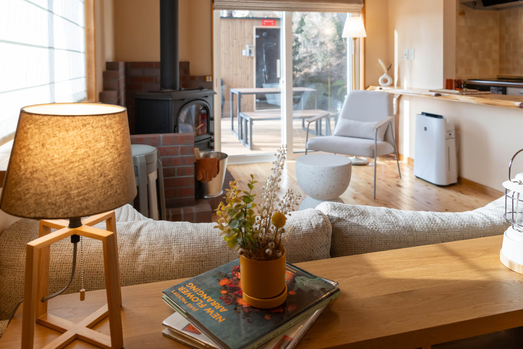 夜は焚火台と薪ストーブが揺らめきを添え、四季の静けさを深めます。