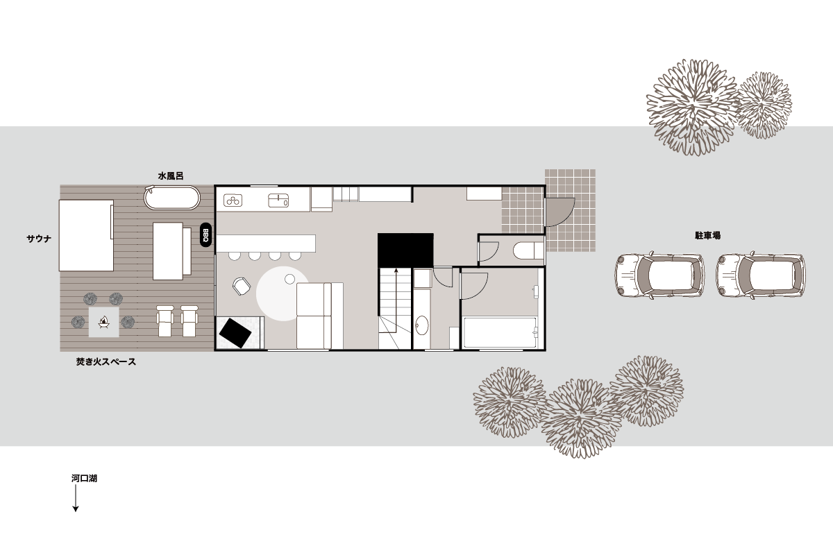 プライベートサウナで温まり、湖面を望む水風呂と外気浴へ最短導線で抜ける“熱→冷→休”が絶景の中で完結します。