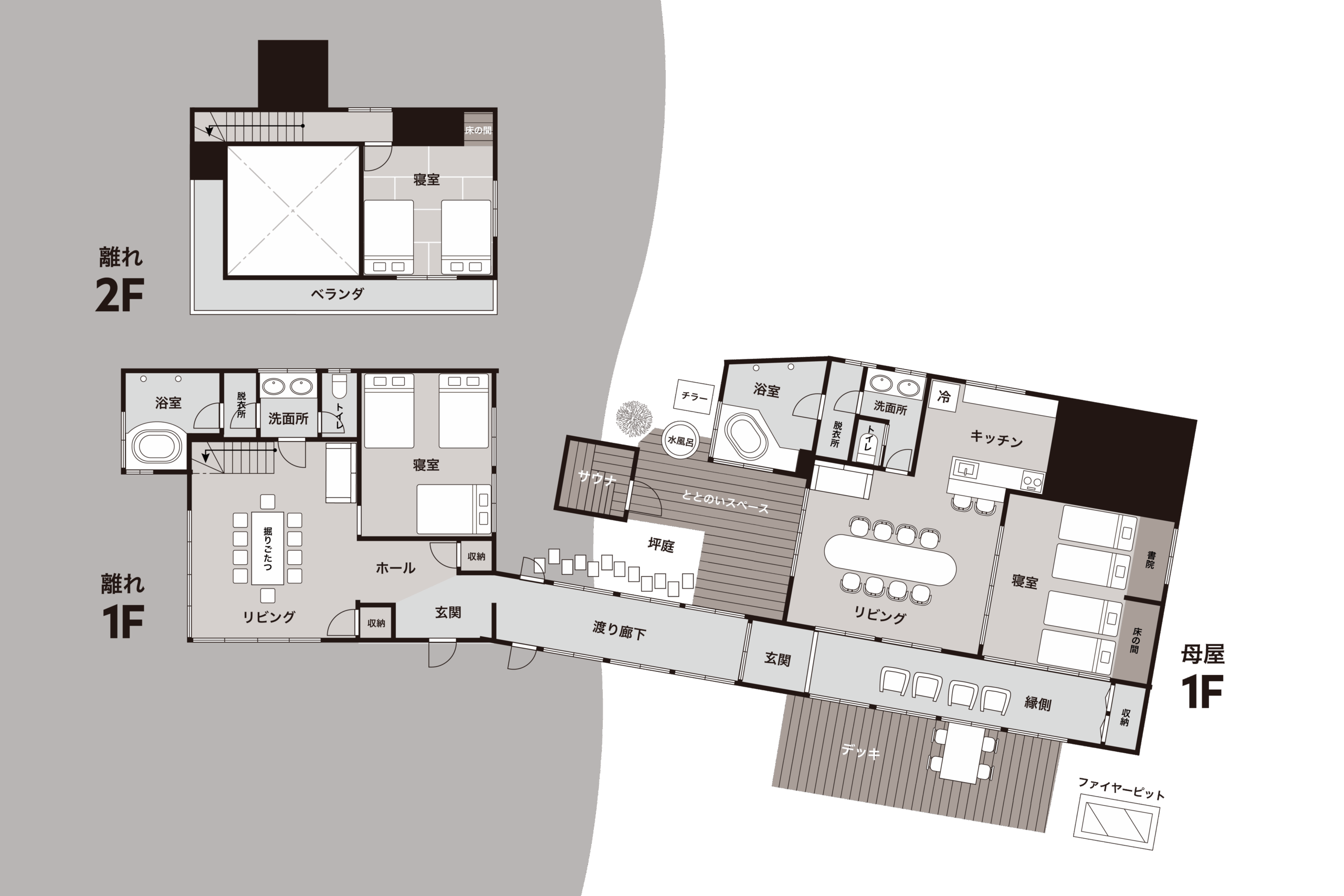 母屋と離れ、広縁や複数の居場所を緩やかにつなぐことで、“一緒に過ごす”と“少し距離を取る”を自然に選べる設計に。