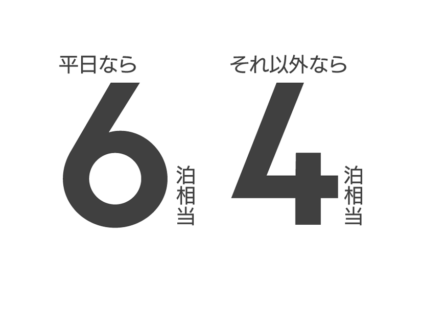 そのため、COCO VILLA 大室山で平日に宿泊を行う場合は6泊、土曜宿泊(平日以外)の場合は4泊利用できます。