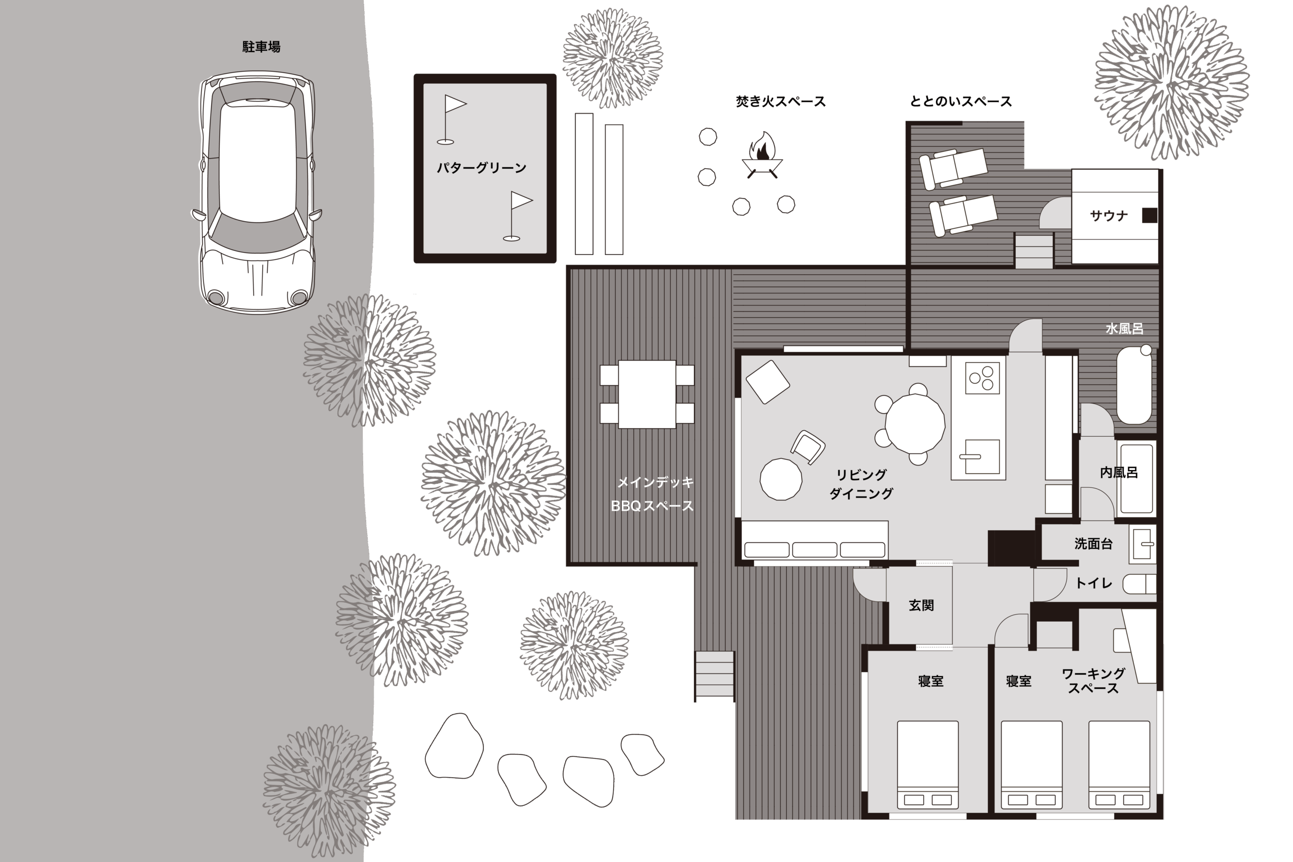 サウナ、焚き火、BBQ、パターゴルフ。