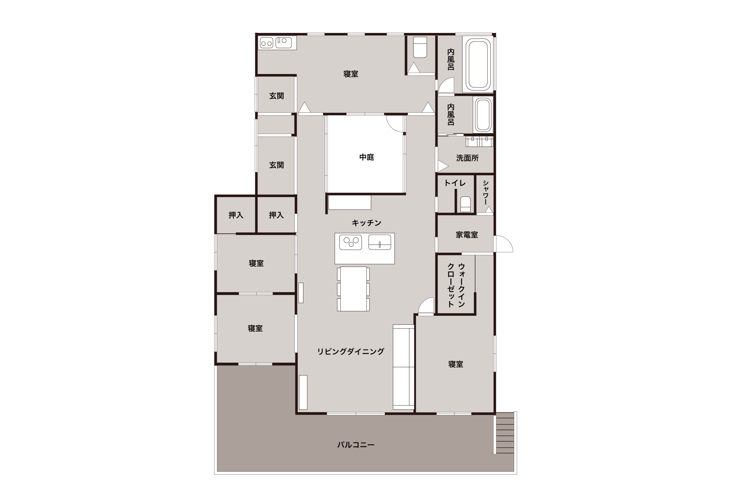 2つある玄関、中庭、天井が高いリビングなど、自然と和を満喫できる、広々とした開放的なプライベート空間です。